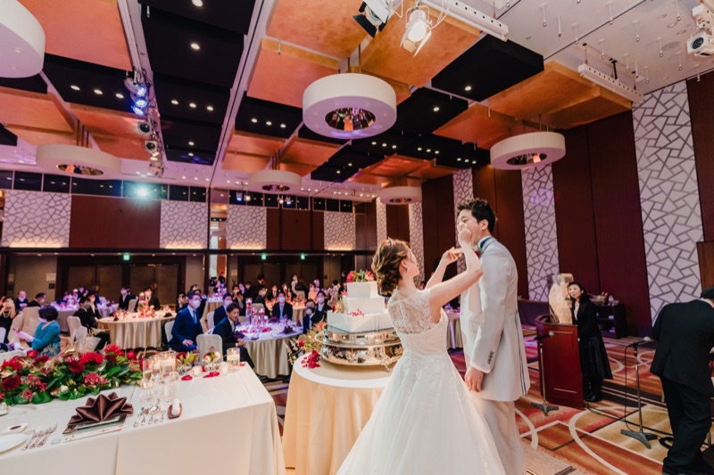 〜感謝を伝えるクリスマスウェディング〜<br><br>ゲストの方へのおもてなしとしてお料理はシェフにオリジナルメニューを作成して頂きました。料理が本当に美味しかった!とたくさんの方に喜んで頂けて嬉しかったです。<br>また、遠方ゲストが半分以上だったので引出物はヒキタクを利用しました。引出物は重いので、荷物が少なくなって好評でした。<br>クリスマスが近かったので会場コーディネートは赤×ゴールドで統一感を、再入場の演出ではイルミネーションのようなプロジェクションマッピングを取り入れました。
