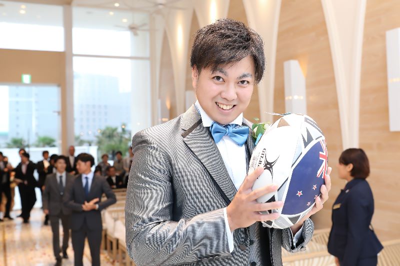 二人とも海が大好きだったので、マリンがコンセプトでした。また、ラグビーチームで出会ったので、ラグビーの品もテーマとして取り入れました!