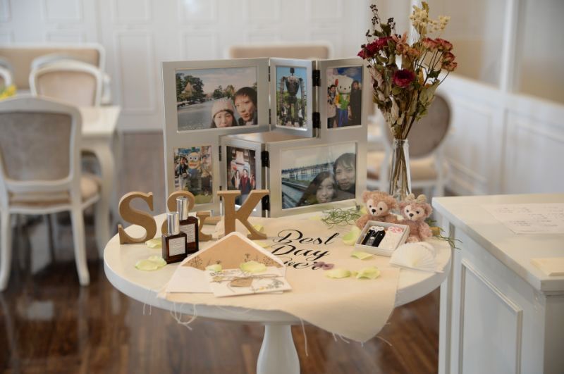 赤を使わない和装婚をしたいとずっと考えていました。<br>式場のカスミソウリースや南フランスをテーマにした披露宴会場が理想通りで、ゲストは「まさかここで和装とは!」と驚いてくれました(笑)