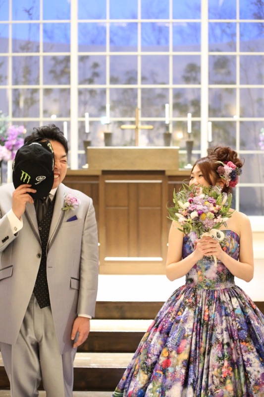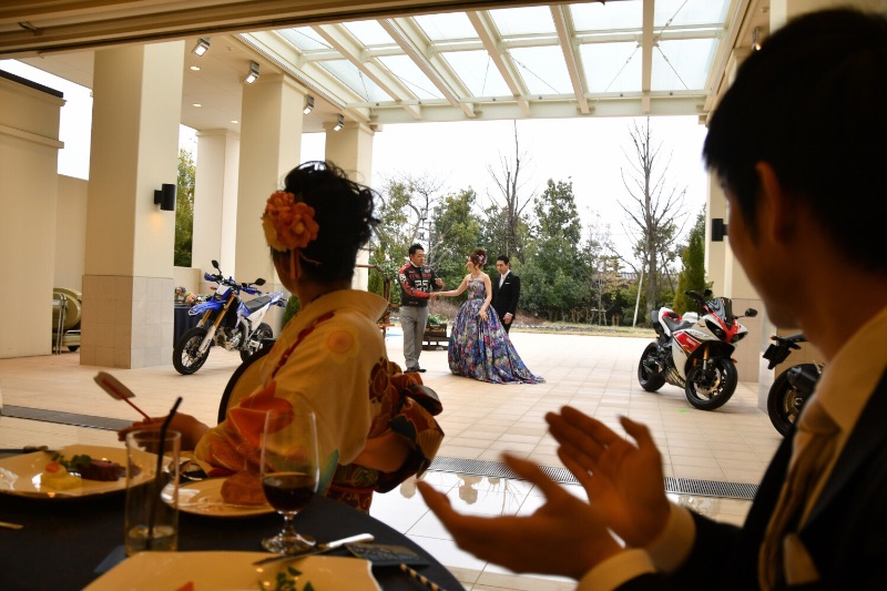 私も旦那もバイクで出会い、プロポーズもバイクの真夏のお祭り「鈴鹿8耐」の翌日だったので、鈴鹿8耐をテーマにしました!<br>結婚が決まった当時は漠然とバイクを飾るぐらいしか決めてなかったけど、プランナーさんからのバイク入場の提案や、小物などの準備を進めていくうちにイメージが固まってきて、バイクを知らない人にも楽しんでもらえる私たちの鈴鹿8耐を開く事が出来ました(^^)