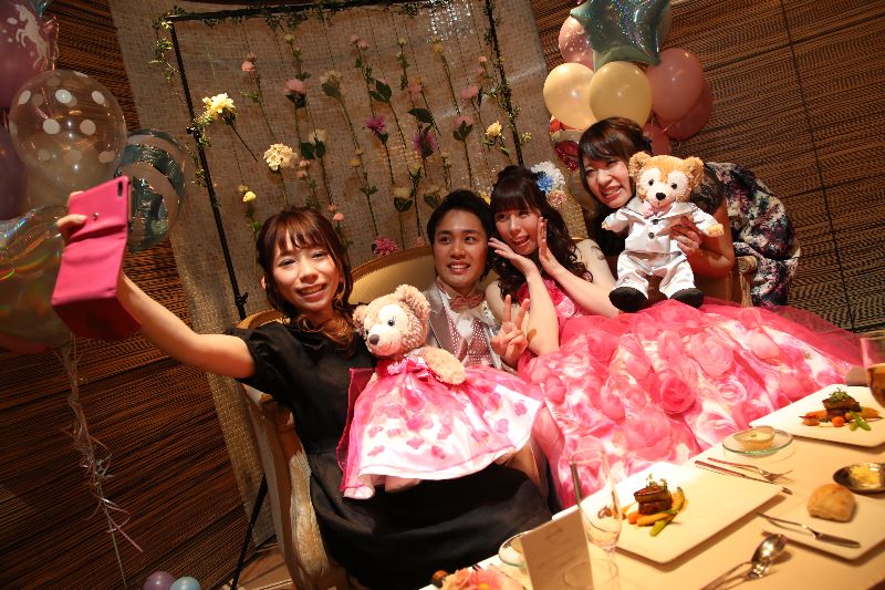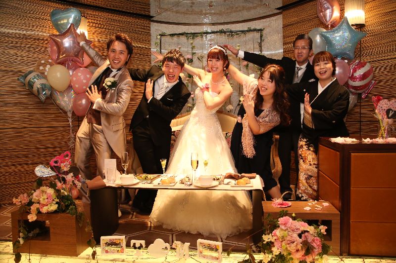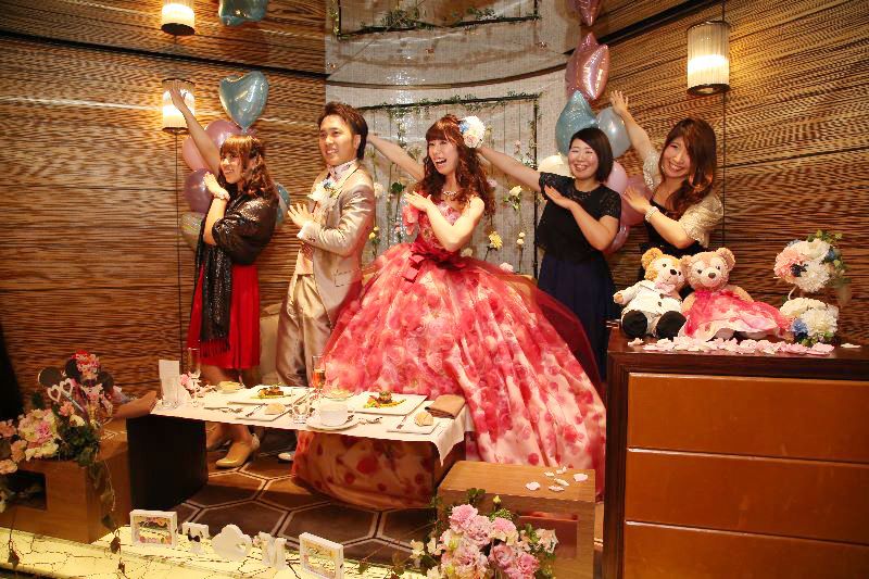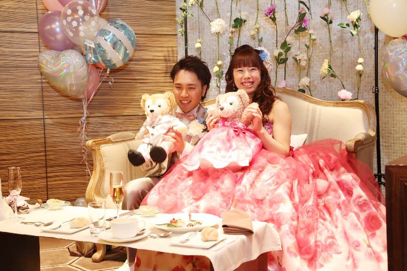 お花とピンクがテーマのアットホームウェディングをテーマにしました。<br>とことんお花をモチーフにできるところはお花を使いました。<br>挙式会場は持ち込んだフラワーペダルをまき、式場でお願いしたバルーンを置き華やかにしました。<br>披露宴会場はドレスが濃いめのピンクだったので、装花や飾りつけはなるべく喧嘩しないように淡い色を使うようにしました。<br>アットホームがテーマだったので高砂をソファーにしました。<br>ソファー席でゲストとの目線も近かったので、常にゲストが席に遊びに来てくれていました。