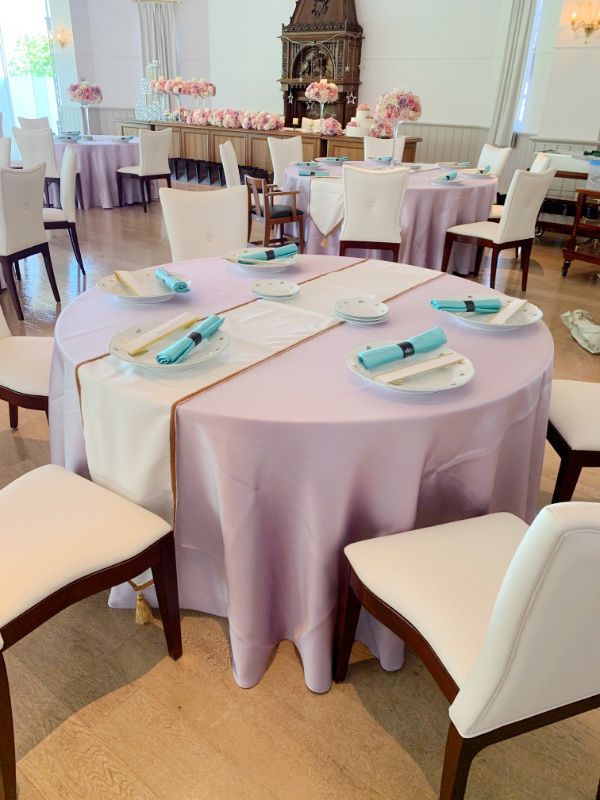 アラビアンナイトウェディングです!<br>アラジンの実写化のニュースを見た時に、インスタ等で「アラビアンナイトウェディング」「アラジンウェディング」などで探してもヒットしなかったので、先駆者になりたくて、これをテーマにしました。(笑)<br>クロスはラベンダー、テーブルランナーはゴールドタッセル、ナフキンはターコイズブルーにして、キャンドルはターコイズブルーとゴールドに、装花はパープルにしました!<br>こだわりまくったゲスト卓でした。