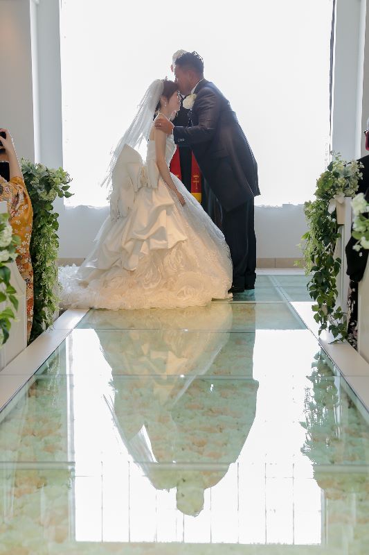 薔薇のバージンロードと空の光射すチャペルで、大きな"リボン"がテーマの結婚式