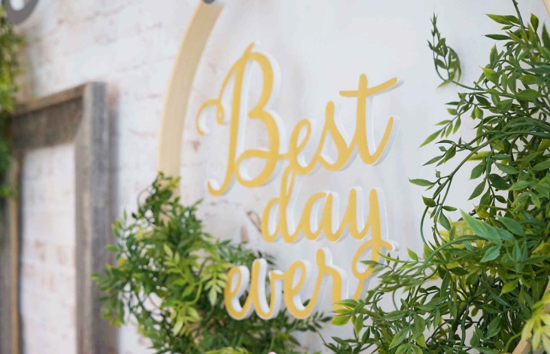 今回のは、フレームとリースにグリーンを取り入れた海外風の空間に飾り付け♪背景はレンガを取り入れ、まるでガーデンにいるかのような気持ちにさせてくれます。会場に到着した花嫁さまもたくさん写真を撮っていらっしゃいました。