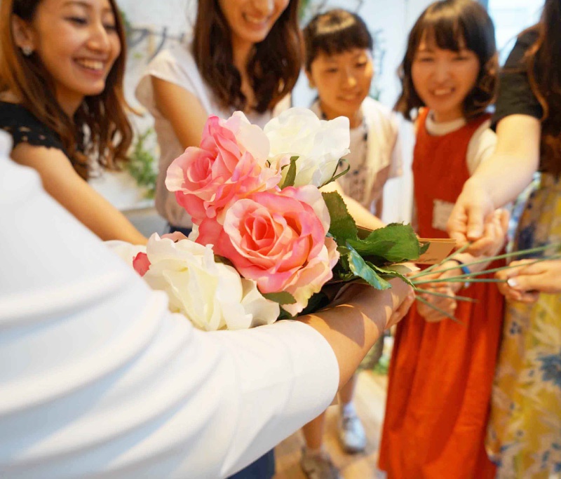今回のハズレなしのくじ引きは、フラワービュッフェをアレンジ!お花を一斉に引き、それに繋がっているカードに描かれているイラストに応じて景品が当たっちゃいます♡皆さまの距離感も近づいて大盛り上がりの様子♪