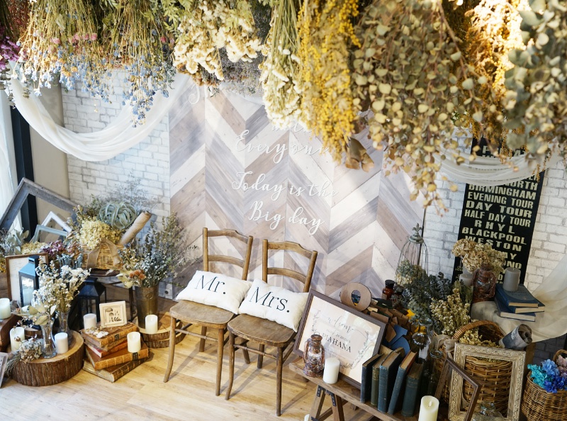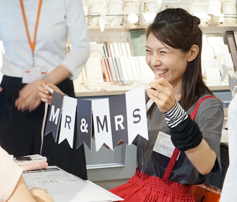 ワークショップは結婚式の万能アイテム、ガーランド作り。お好みのデザインを選んでいただき、可愛らしいガーランドが完成♪前撮りやウェルカムスペースなどで活躍すること間違いなし!ぜひ、当日使ってくださいね♡