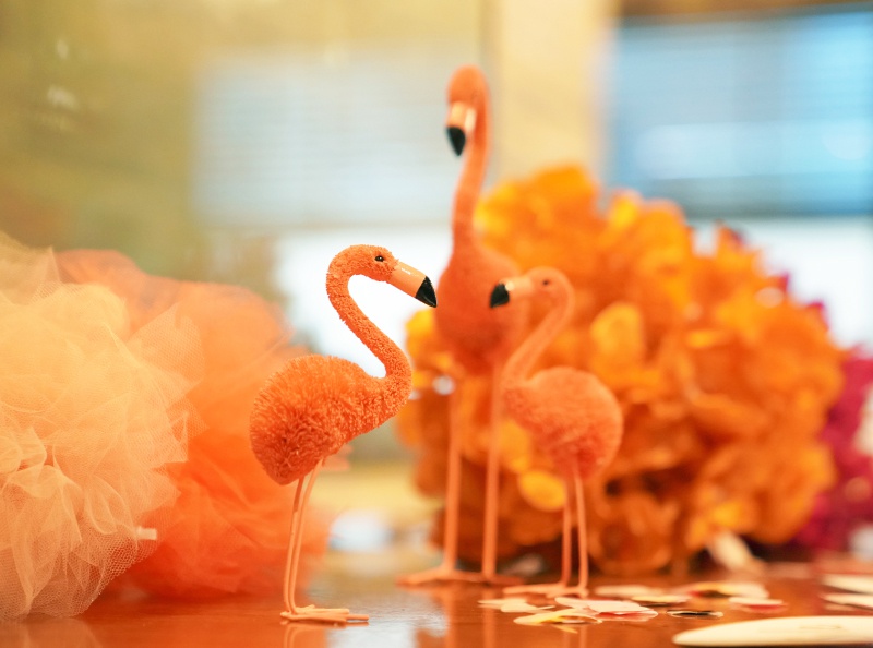 今回のテーマは「PINK×PINK」♡ホットピンクをふんだんに使ってパーティーのようなにぎやかな空間を演出!ところどころにいるフラミンゴとモンステラの葉が南国っぽい雰囲気もプラスしてくれます♪ポップでキュートな装飾は、見ているだけでワクワクした気分になりますね♪