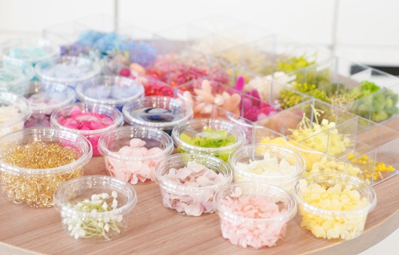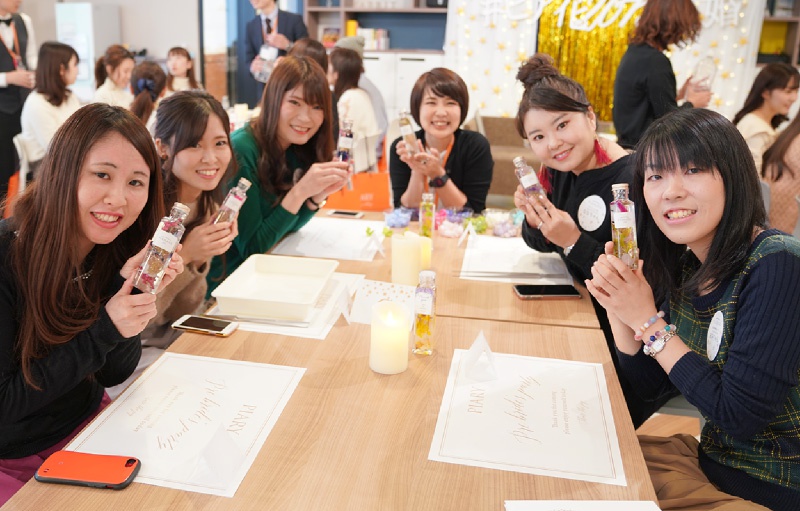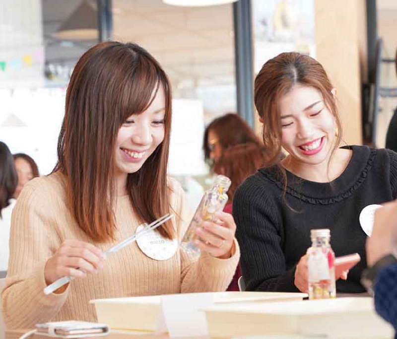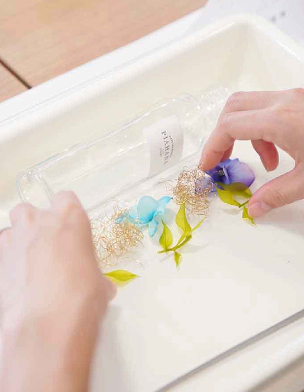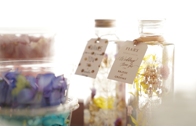 今回のワークショップは、ピア花会で大人気のハーバリウム作り!色とりどりのドライフラワーやアジサイなどの造花を組み合わせたミックスタイプを体験♪お花の色味や瓶詰めする順番で色んな表情を見せてくれる演出アイテム。ウェルカムスペースや会場の卓記号などに使用しても、とってもオシャレ♡完成後は星の装飾と一緒に撮ったり、同じテーブルのピア花仲間と並べて撮影会♪