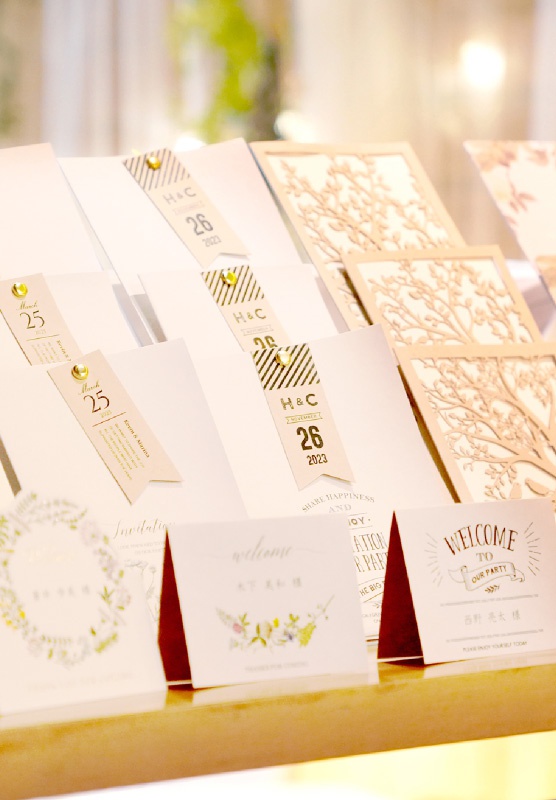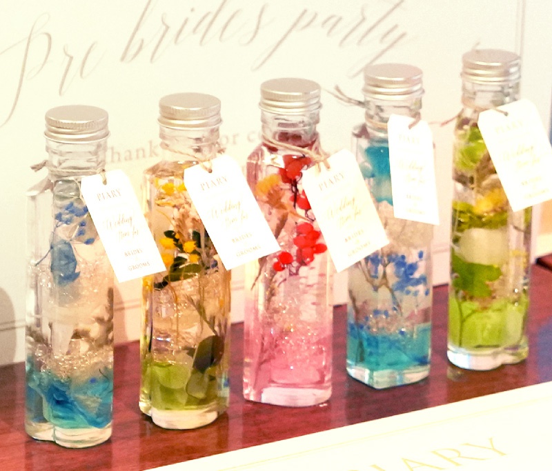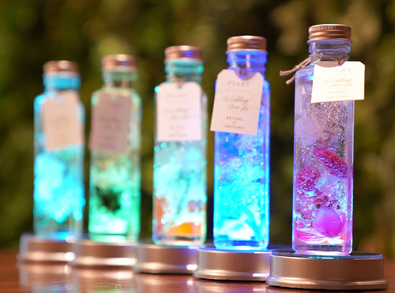 液が二層に分かれている新しいタイプのハーバリウムは、ライトの上に乗せると光が液に浸透し七色に輝きます♪照明を暗くしてサプライズの演出として取り入れるのもおすすめ。高砂やゲストテーブルを華やかにさせるおしゃれなアイテム!