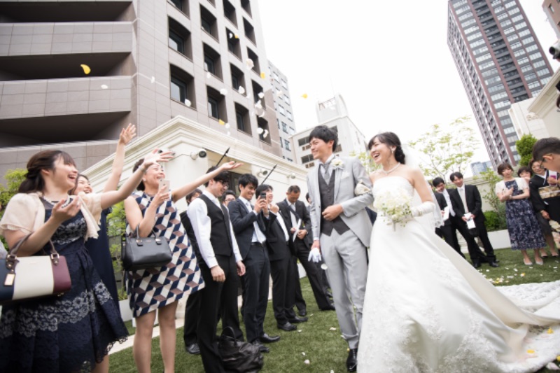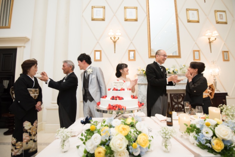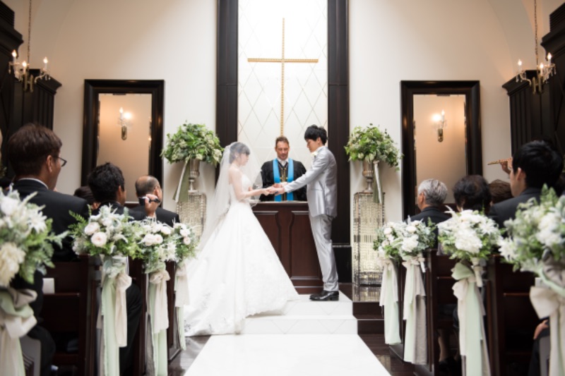 シンプルに王道です!<br>重厚感のある厳かな雰囲気を崩しすぎず、白黒にテーマカラーの水色(サムシングブルー)を足した柔らかい印象の私たちらしい式にすることで、ゲストとゆったりと過ごすことをテーマにしました。