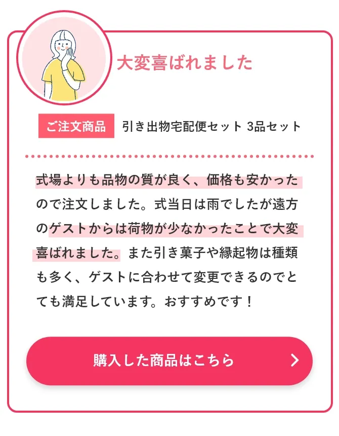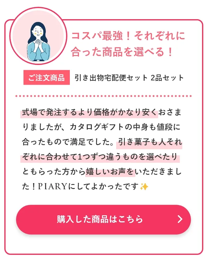 大体購入後、1週間程で手元に届きました!引き出物カードは2品(記念品+引菓子) もしくは3品(記念品+引菓子+縁起物)から選ぶ事ができ、価格も2品の場合¥4,800〜3品の場合¥5,800〜選ぶ事ができます!ランクも¥2,000〜¥3,000ごとに設定されており、振り分けもバッチリできそうです🙆♀️無料の手提げ袋も付いてくるので、万が一カードケースでもカバンに入らない時でも安心です✨