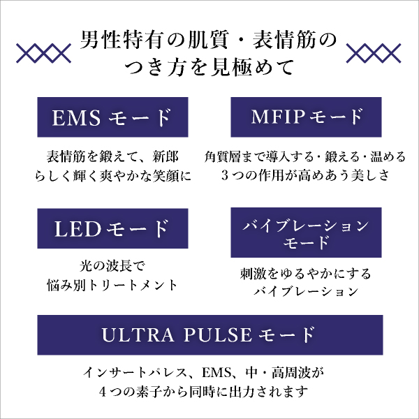 EXZ HOMMEは、エステティック業界で実績のあるARTISTIC&CO.が開発した日本初の男性用美顔器です。通常の美顔器と異なり、すべての機能を男性の筋肉に合わせてパワフルに調整しています。
