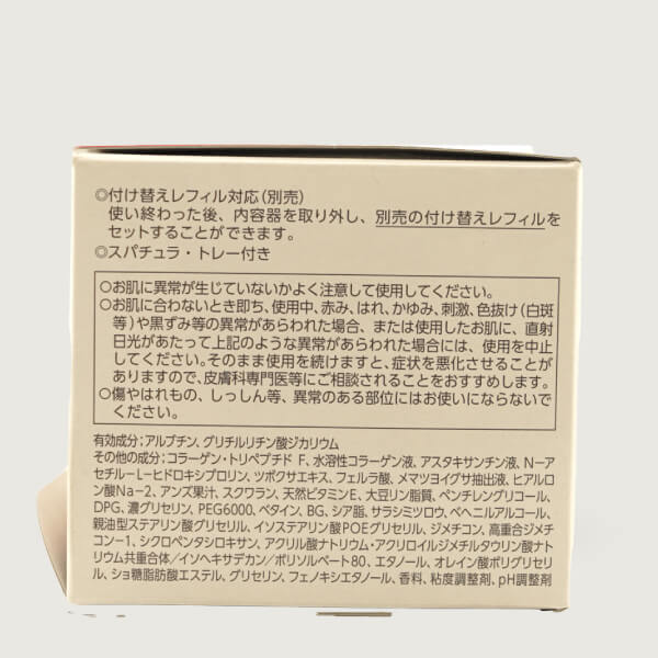 | 内容 | ■ブランド アスタリフト / ASTALIFT ■内容量 30g ■ご使用方法 ○化粧水や美容液などで肌を整えた後、適量を手に取り、顔全体にやさしく伸ばします。 ○手のひらで顔全体を包み込み、やさしくなじませます。 ■成分 コラーゲン・トリペプチド F/水溶性コラーゲン液/アスタキサンチン液/N-アセチル-L-ヒドロキシプロリン/ツボクサエキス/フェルラ酸/メマツヨイグサ抽出液/ヒアルロン酸Na-2/アンズ果汁/スクワラン/天然ビタミンE/大豆リン脂質/ペンチレングリコール/DPG/濃グリセリン/PEG6000/ベタイン/BG/シア脂/サラシミツロウ/ベヘニルアルコール/親油型ステアリン酸グリセリル/イソステアリン酸POEグリセリル/ジメチコン/高重合ジメチコン-1/シクロペンタシロキサン/アクリル酸ナトリウム・アクリロイルジメチルタウリン酸ナトリウム共重合体/イソヘキサデカン/ポリソルベート80/エタノール/オレイン酸ポリグリセリル/ショ糖脂肪酸エステル/グリセリン/フェノキシエタノール/香料/粘度調整剤/pH調整剤 ※商品の改良や表示方法の変更などにより、実際の成分と一部異なる場合があります。実際の成分は商品の表示をご覧ください。 |