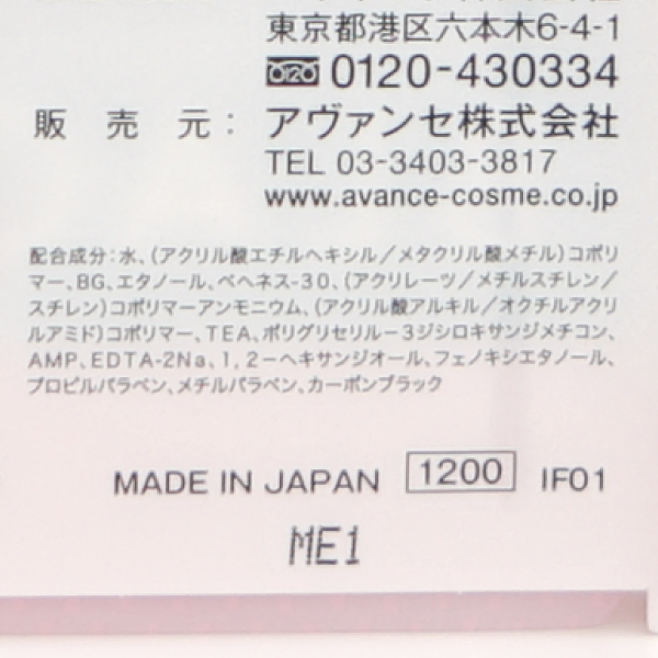 | 内容 | ■ブランド アヴァンセ / Avance ■ご使用方法 上下によく振ってからご使用ください。 ■成分 水/(アクリル酸エチルへキシル/メタクリル酸メチル)コポリマー/BG/エタノール/ベヘネス-30/(アクリレーツ/メチルスチレン/スチレン)コポリマーアンモニウム/(アクリル酸アルキル/オクチルアクリルアミド)コポリマー /TEA/ポリグリセリル-3ジシロキサンジメチコン/AMP/EDTA-2Na/1/2-ヘキサンジオール/フェノキシエタノール/プロピルパラベン/メチルパラベン/カーボンブラック ※商品の改良や表示方法の変更などにより、実際の成分と一部異なる場合があります。実際の成分は商品の表示をご覧ください。 |