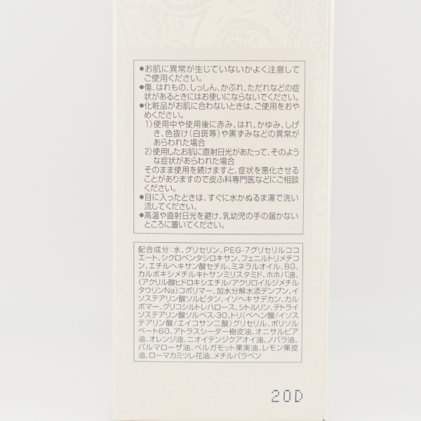 | 内容 | ■ブランド カバーマーク / COVERMARK ■内容量 200g ■ご使用方法 1.手のひらに適量(3プッシュ)を取り、お顔全体になじませてください。 (ご使用量が少なすぎると、メイクアップが十分に落とせない場合があります。適量を守ってお使い下さい。) 2.顔の中心から外側に向かって、くるくると螺旋を描きながらなじませていきます。 Point)なじませるときは、やさしくマッサージする要領で、小鼻の周りなど毛穴にファンデーションが入りやすい部分や、アイメイクをしている目もとまで念入りになじませてください。 3.水またはぬるま湯で洗い流したあと、洗顔料で洗顔してください。 ※初めてご使用される際には、ディスペンサーについているストッパーを引いて外し、中身が出るまで空押ししてください。 ※ポンプ変更により、吐出量が4〜5から3プッシュに変更となりました。 ■成分 水 / グリセリン / PEG-7グリセリルココエート / シクロペンタシロキサン / フェニルトリメチコン / エチルヘキサン酸セチル / ミネラルオイル / BG / カルボキシメチルキトサンミリスタミド / ホホバ油 / (アクリル酸ヒドロキシエチル/アクリロイルジメチルタウリンNa)コポリマー / 加水分解水添デンプン / イソステアリン酸ソルビタン / イソヘキサデカン / カルボマー / グリコシルトレハロース / シトルリン / テトライソステアリン酸ソルベス-30 / トリ(ベヘン酸/イソステアリン酸/エイコサン二酸)グリセリル / ポリソルベート60 / アトラスシーダー樹皮油 / オニサルビア油 / オレンジ油 / ニオイテンジクアオイ油 / ノバラ油 / パルマローザ油 / ベルガモット果実油 / レモン果皮油 / ローマカミツレ花油 / メチルパラベン ※商品の改良や表示方法の変更などにより、実際の成分と一部異なる場合があります。実際の成分は商品の表示をご覧ください。 |