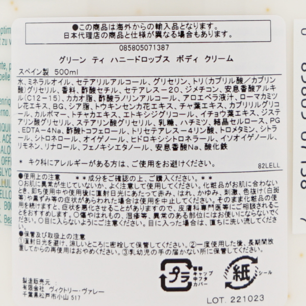 | 内容 | ■ブランド エリザベスアーデン / ELIZABETH ARDEN ■内容量 500ml ■ご使用方法 適量を身体に塗布し、なじませてご使用ください。 ■成分 水/ミネラルオイル/セテアリルアルコール/グリセリン/トリ(カプリル酸/カプリン酸)グリセリル/香料/酢酸セチル/セテアレス-20/ジメチコン/安息香酸アルキル(C12-15)/カカオ脂/酢酸ラノリンアルコール/アロエベラ液汁/ローマカミツレ花エキス/BG/シア脂/トウキンセンカ花エキス/チャ葉エキス/カプリリルグリコール/カルポマー/トチャカエキス/エトキシジグリコール/イチョウ葉エキス/ジステアリン酸グリセリル/ステアリン酸グリセリル/乳糖/ハチミツ/結晶セルロース/PG/EDTA-4Na/酢酸トコフェロール/トリセテアレス-4リン酸/トロメタミン/シトラール/シトロネロール/オイゲノール/ヒドロキシシトロネラール/イソオイゲノール/リモネン/リナロール/フェノキシエタノール/安息香酸Na/酸化鉄 ※キク科にアレルギーがある方は/ご使用をお避けください。 ※商品の改良や表示方法の変更などにより、実際の成分と一部異なる場合があります。実際の成分は商品の表示をご覧ください。 |