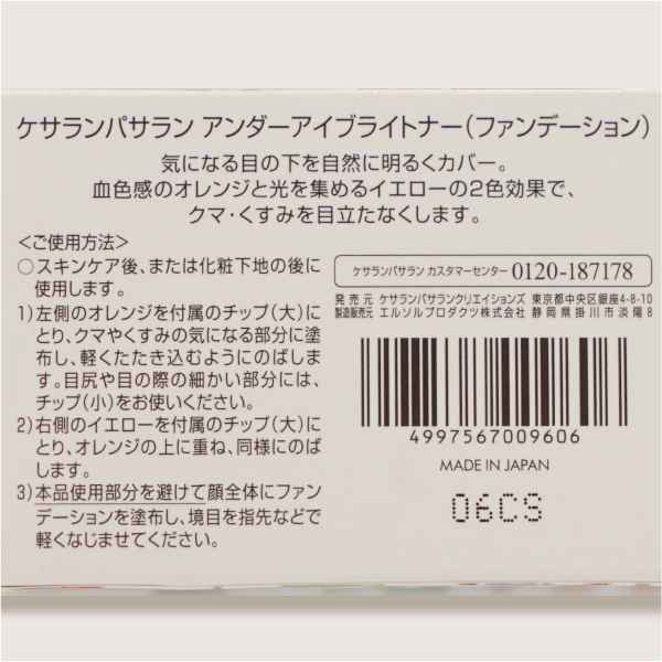 | 内容 | ■ブランド ケサランパサラン / Kesalan Patharan ■ご使用方法 STEP 1 スキンケア後、または化粧下地の後に使用します。オレンジをチップ(大)にとり、クマやくすみの気になる部分に塗布します。 STEP 2 チップ(大)でオレンジを軽くたたき込むようにしてのばします。 STEP 3 イエローをチップ(大)にとり、オレンジの上に重ね、軽くたたき込むようにしてのばします。 |