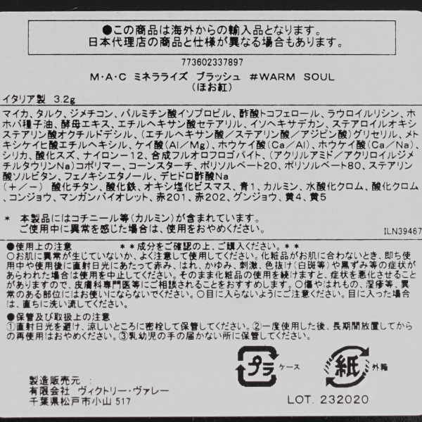 | 内容 | ■ブランド マック / MAC ■内容量 3.2g ■ご使用方法 #129 パウダー/ブラッシュ ブラシ等でお好きな量を塗布し、肌に十分なじませます。 ■成分 タルク・ジメチコン・パルミチン酸イソプロピル・ポリソルベート20・(オクタン酸/ステアリン酸/アジピン酸)グリセリル・ケイ酸(Al/Mg)・(アクリルアミド/アクリロイルジメチルタウリンNa)コポリマー・ホホバ種子油・イソヘキサデカン・エチルヘキサン酸セテアリル・ステアリン酸ソルビタン・ステアロイルオキシステアリン酸オクチルドデシル・酢酸トコフェロール・酵母エキス・ラウロイルリシン・メトキシケイヒ酸エチルヘキシル・コーンスターチ・ナイロン-12・ポリソルベート80・フェノキシエタノール・デヒドロ酢酸Na +/- マイカ・酸化チタン・酸化鉄・ホウケイ酸(Ca/Al)・黄4・シリカ・赤202・黄5・グンジョウ・酸化スズ・赤201・ホウケイ酸(Ca/Na)・合成金雲母 ※商品の改良や表示方法の変更などにより、実際の成分と一部異なる場合があります。実際の成分は商品の表示をご覧ください。  |