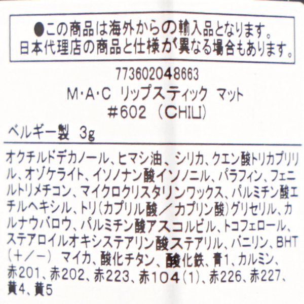 | 内容 | ■ブランド マック / MAC ■内容量 3g ■ご使用方法 1.美しい仕上がりを持続させるためには、はじめにMACプレップ プライム リップを唇に塗布します。 2.リップスティックを唇に塗布します。リトラクタブル リップ ブラシをお使いいただくと、リップラインなどのより繊細なラインを正確に美しく描けます。 ■成分 オクチルドデカノール/ヒマシ油/クエン酸トリカプリリル/オゾケライト/イソノナン酸イソノニル/パラフィン/フェニルトリメチコン/マイクロクリスタリンワックス/パルミチン酸エチルヘキシル/トリ(カプリル酸/カプリン酸)グリセリル/カルナウバロウ/ステアロイルオキシステアリン酸ステアリル/バニリン/トコフェロール/パルミチン酸アスコルビル/PET/アクリレーツコポリマー +/- シリカ/赤201/酸化チタン/硫酸Ba/酸化鉄/赤202/黄4/赤104(1)/赤227/水酸化Al/赤226/青1 JILN7370 ※商品の改良や表示方法の変更などにより、実際の成分と一部異なる場合があります。実際の成分は商品の表示をご覧ください。 |