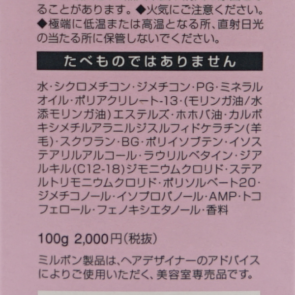 | 内容 | ■ブランド ミルボン / MILBON ■内容量 100g ■ご使用方法 1.手に伸ばし、髪につける。 毛先→中間→根元付近の順に塗布して乾かします。 2.にぎりスルードライ 毛束をにぎってテンションをかけながら、毛先に向かってしっかり熱が伝わるようゆっくりすべらせていきます。 3.毛先をドライ 毛先をつかんで、顔の内側に向かって指でワンカールを作ったら、カールの内側にドライヤーの熱を加えます。 ■成分 水/シクロメチコン/ジメチコン/PG/ミネラルオイル/ポリアクリレート-13/(モリンガ油/水添モリンガ油)エステルズ/ホホバ油/カルボキシメチルアラニルジスルフィドケラチン(羊毛)/スクワラン/BG/ポリイソブテン/イソステアリルアルコール/ラウリルベタイン/ジアルキル(C12-18)ジモニウムクロリド/ステアルトリモニウムクロリド/ポリソルベート20/ジメチコノール/イソプロパノール/AMP/トコフェロール/フェノキシエタノール/香料 ※商品の改良や表示方法の変更などにより、実際の成分と一部異なる場合があります。実際の成分は商品の表示をご覧ください。 |