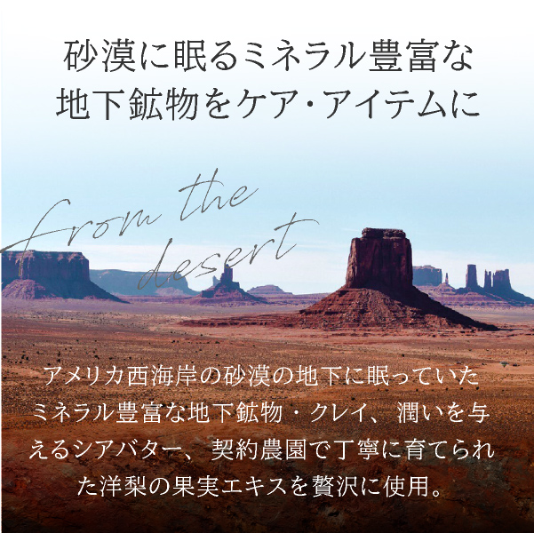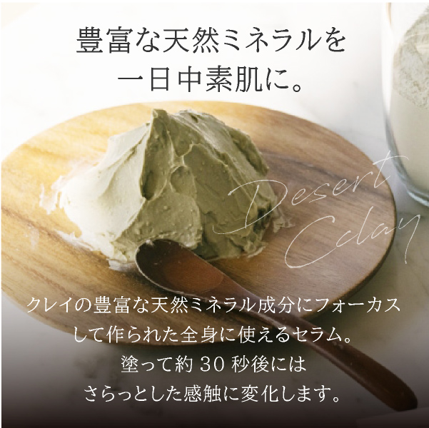 | 材質 | 水(伏流水)/日本産(信州) モンモリロナイト(鉱物(クレイ))/アメリカ産 ダマスクバラ花水(ダマスクバラ)/日本産 シア脂(シア)/ガーナ産 コメ胚芽油(コメ)/日本産 BG(サトウキビ)/日本産 グリセリン(植物油脂 菜種/大豆/パーム)/日本産 1,2-ヘキサンジオール(化成)/日本産 セイヨウナシ果実エキス(ラフランス(洋ナシ))/日本産 ホホバ油(ホホバ)/メキシコ産 ツバキ油(ヤブツバキ)/日本産 トウキンセンカ花エキス(マリーゴールド)/日本産 クロレラエキス(クロレラ)/日本産 カッコンエキス(カッコン)/日本産 アロエベラ葉エキス(アロエベラ)/日本産 褐藻エキス(マコンブ)/日本産 合成界面活性剤・エタノール・パラベン・合成香料等不使用 |