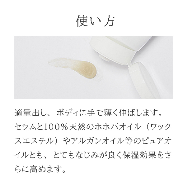 全身の乾燥や、肌荒れが気になる部分などに / お休み前のケアやすっぴんでお出かけするときの素肌ケアに / パーティの前に素肌を美しくみせたいときに / ピュアオイルとの相性は抜群