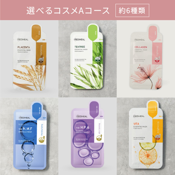 お好きなパック1点と、お好きなコスメ1点、選べるカード型カタログを1点を自由に組み合わせていただけます。