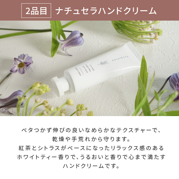 ナチュセラハンドクリームは、うるおいと香りで心まで満たすハンドクリーム。ベタつかず伸びの良いなめらかなテクスチャーは、乾燥や手荒れから守ります。紅茶とシトラスがベースになったリラックス感のあるホワイトティーの香りは、石鹸やボディソープを思わせるニュアンスもあり清潔感抜群!クセも無く、男女問わずご使用いただきやすいやわらかい香りです。