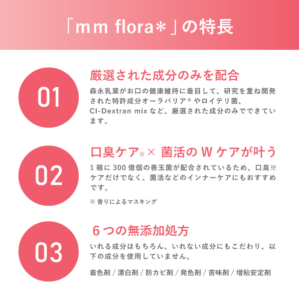 1粒に乳酸菌をたっぷり配合し、毎日のオーラルケアを手軽にサポート。森永乳業の特許成分「オーラバリア」に加え、複数種類の乳酸菌とビフィズス菌をバランス良く配合しました。香りで息をリフレッシュし、寝る前や外出先でも水なしでなめるだけ。カロリー控えめ、無添加で安心して続けられます。