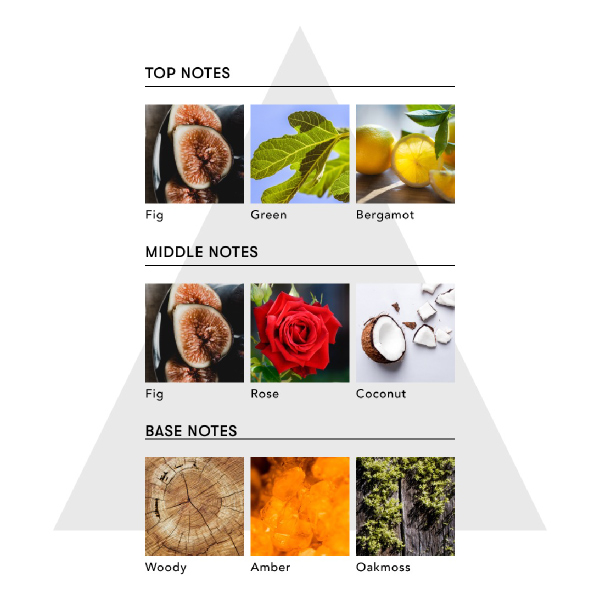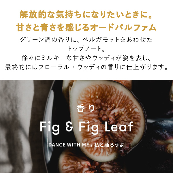 フィグにグリーン、ベルガモットをあわせたトップはスタイリッシュな甘さが広がります。徐々にミルキーな甘さやウッディが姿を表し、最終的にはグリーン・フローラル・ウッディの香りに仕上がります。肌にも嬉しい植物由来のアルコールを使用しています。