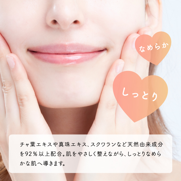 チャ葉エキスや真珠エキス、スクワランなど、天然由来の成分で、肌に優しく安心してご使用いただけます。