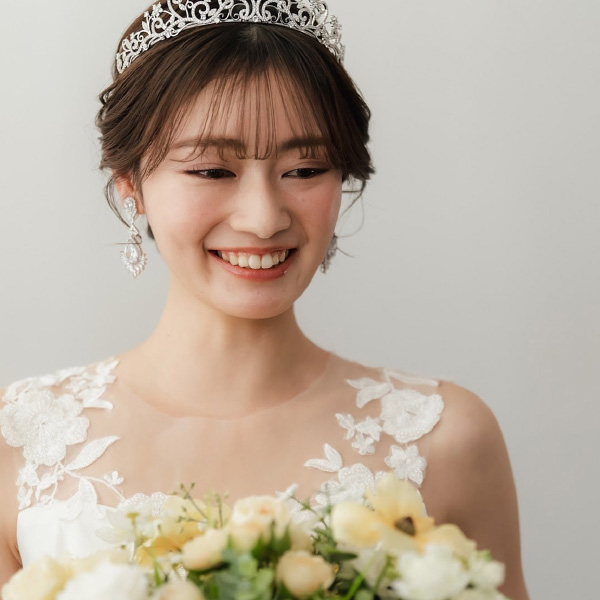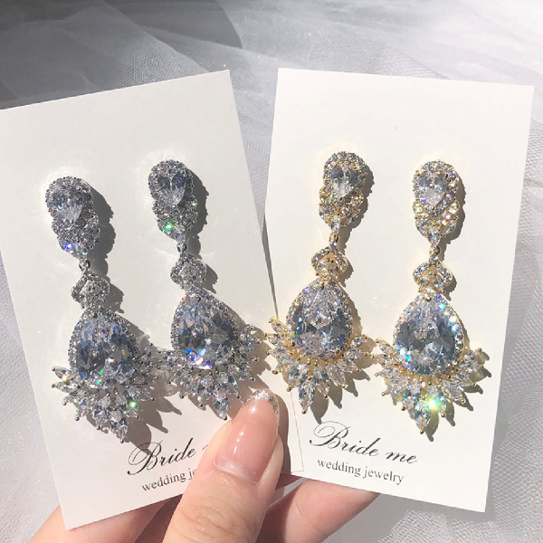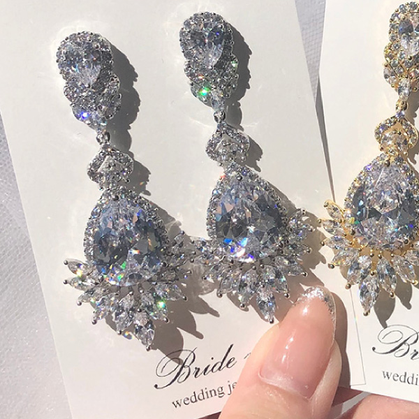 大きくカットされたジルコニアが圧倒的な存在感を放つ、大振りのロングイヤリングです。周りに小さめにカットされたジルコニアが施されており、太陽のようにパッと明るく華やかにみせてくれます。動くたびにキラキラと輝きを放ち、お写真映りも華やかに演出してくれます。シルバーのお色味は、カラードレスとも相性が良いアクセサリーです。