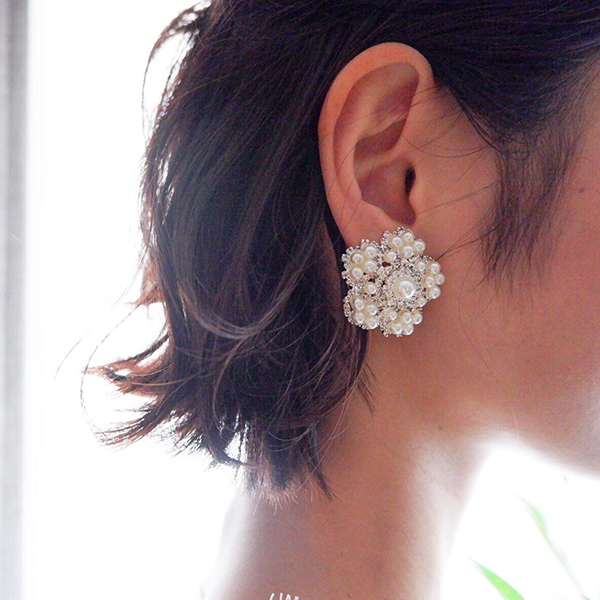 たくさんパールとビジューを使用した被らないデザインで華やかなイヤリング。