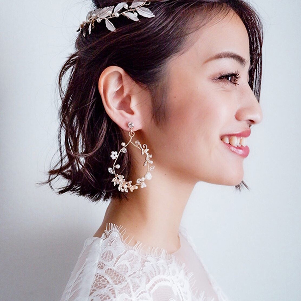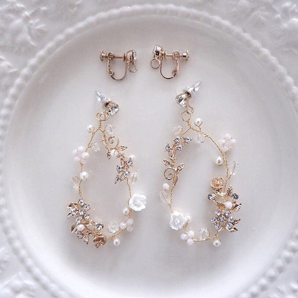 ドロップ型のブライダルイヤリングで、ゴールドカラーの華奢なデザインが印象的です。