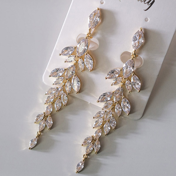 ジルコニアの輝きが、まるで本物のダイヤモンドのような輝きと美しさを放つ、ゴールドカラーのブライダルイヤリング。