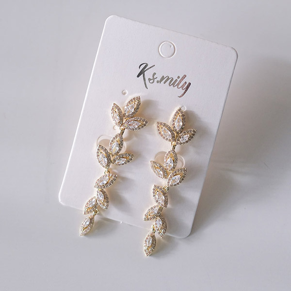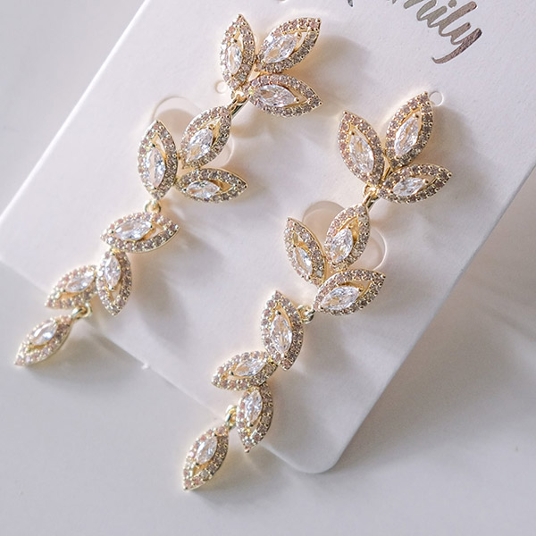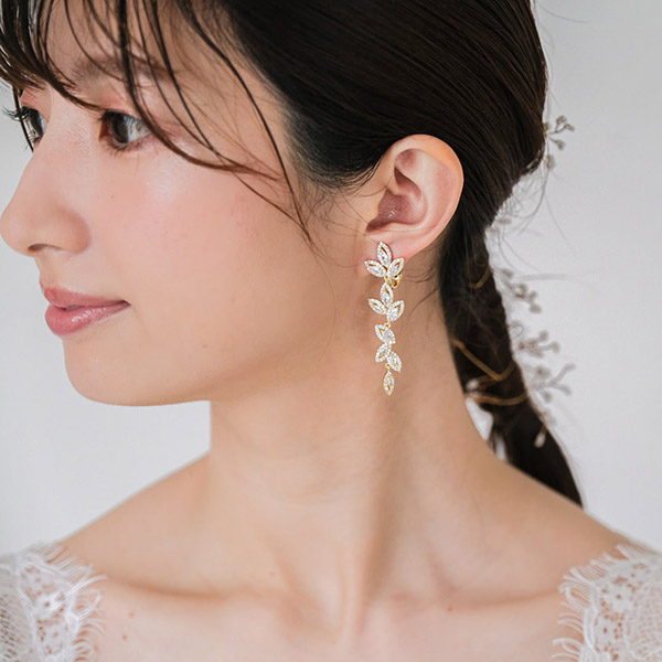 ジルコニアの輝きが、まるで本物のダイヤモンドのような輝きと美しさを放つ、ゴールドカラーのブライダルイヤリング。