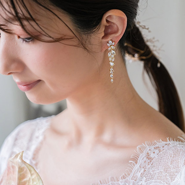 ジルコニアの輝きが、まるで本物のダイヤモンドのような輝きと美しさを放つ、ゴールドカラーのブライダルイヤリング。
