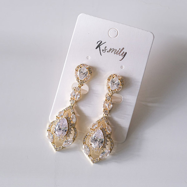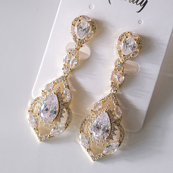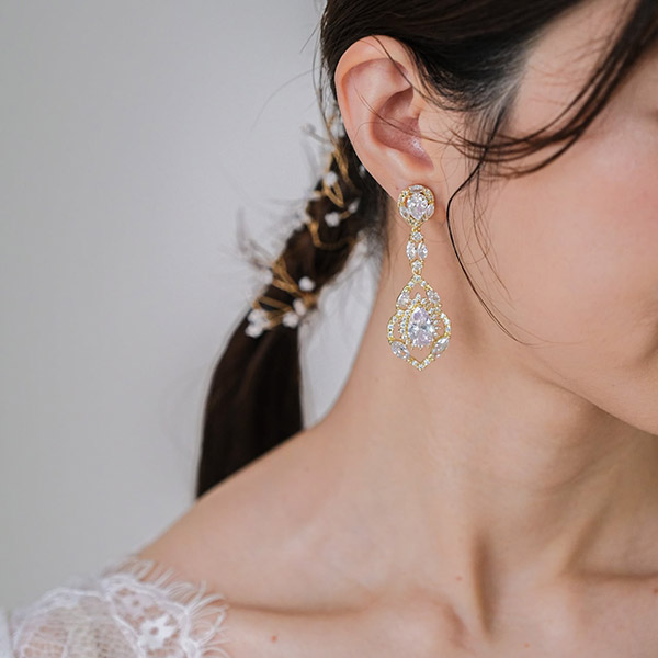 ジルコニアの輝きが、まるで本物のダイヤモンドのような輝きと美しさを放つ、ゴールドカラーのブライダルイヤリング。