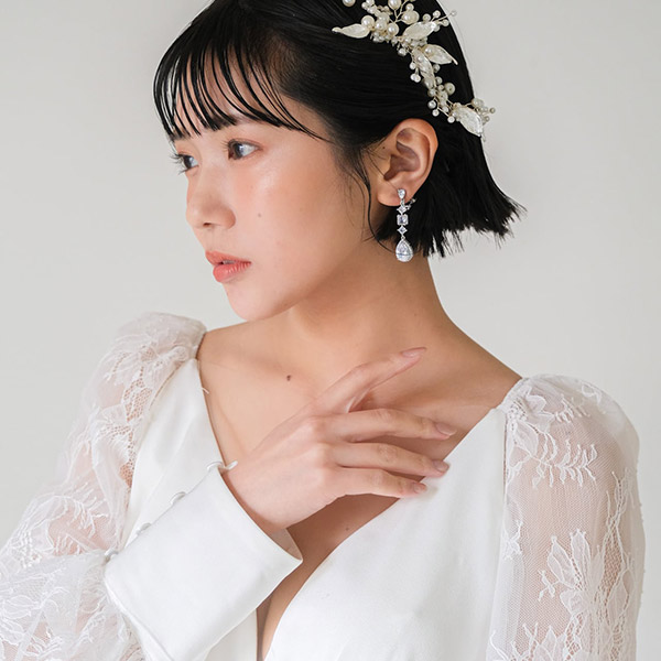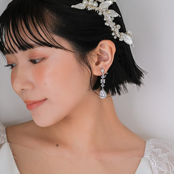 ジルコニアデザインの個性的なカットが、輝きと美しさを放つ、シルバーカラーのブライダルイヤリング。