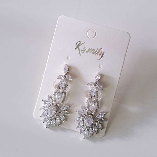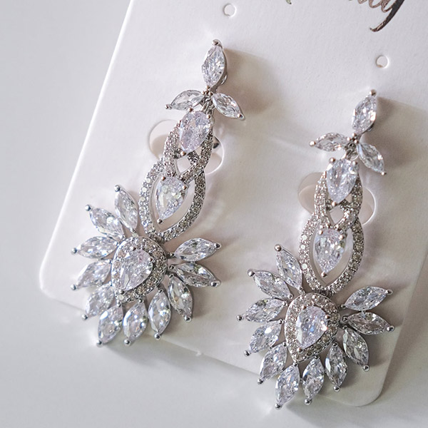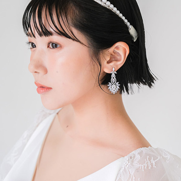 ジルコニアデザインの個性的なカットが、輝きと美しさを放つ、シルバーカラーのブライダルイヤリング。