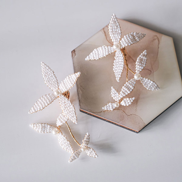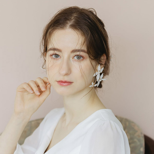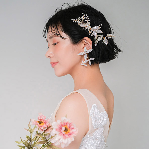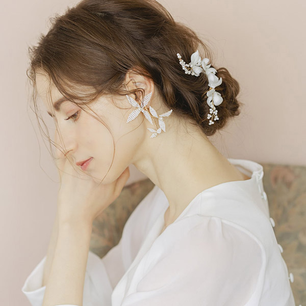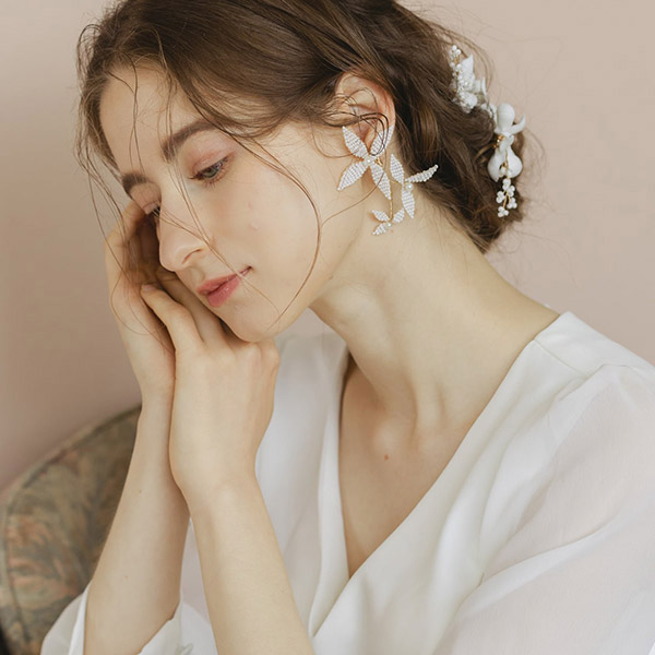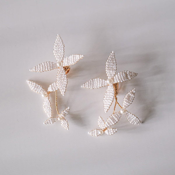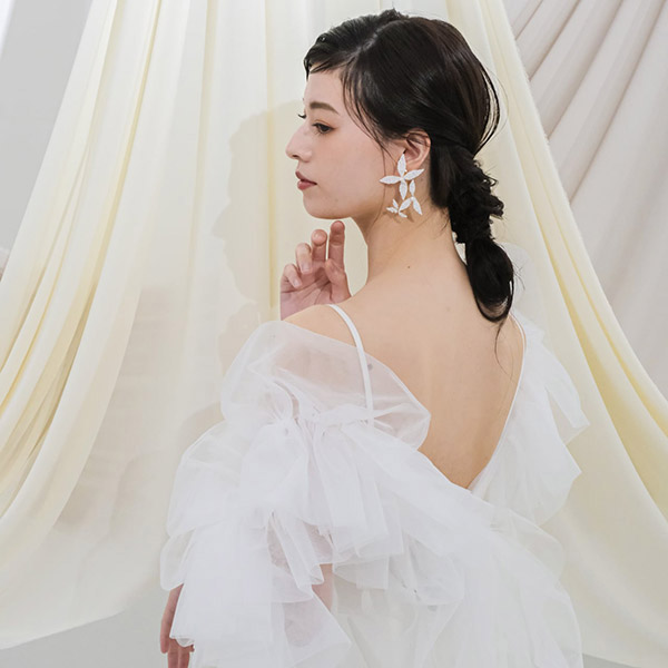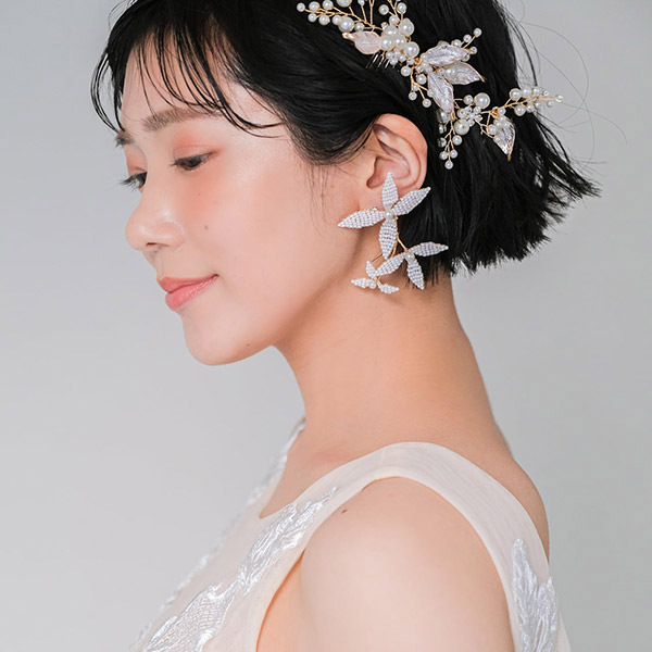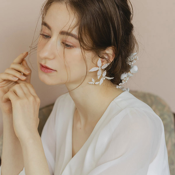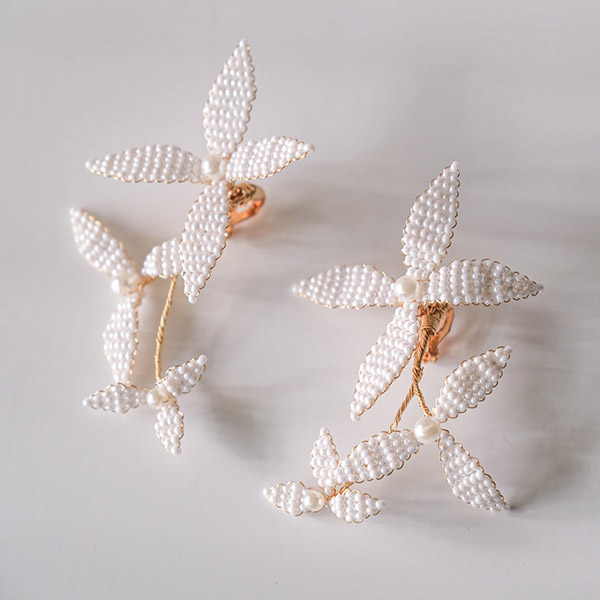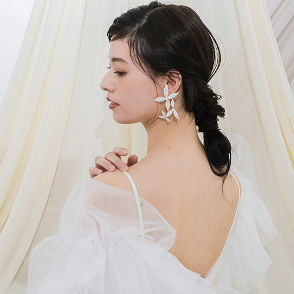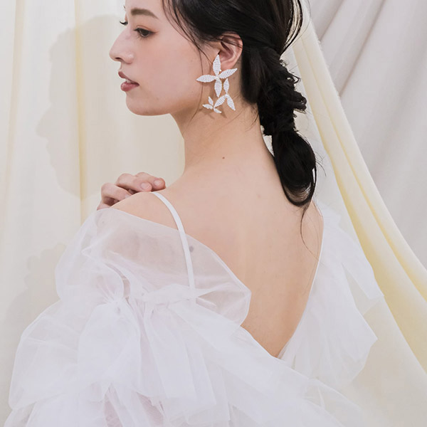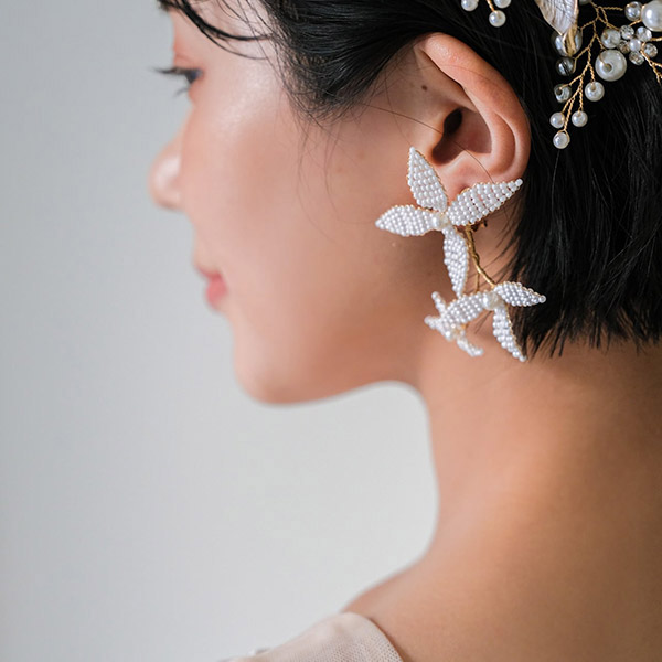 ブライダルシーンにぴったりの白いフラワーが優雅に揺れ、耳元に揺らめく上品なパールが、女性の繊細な美しさを際立たせます♪