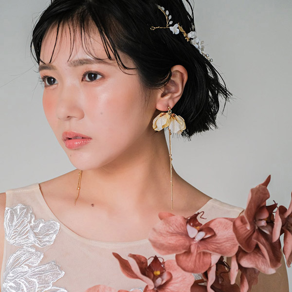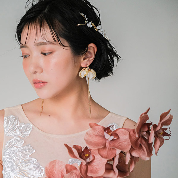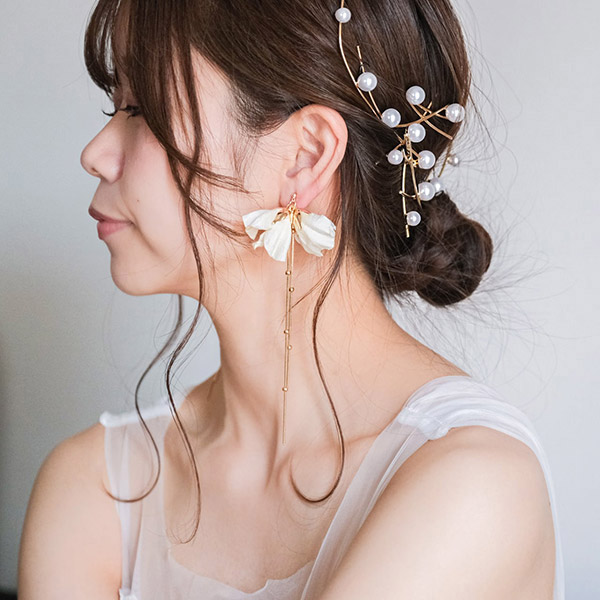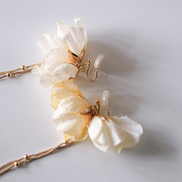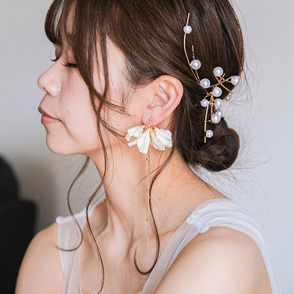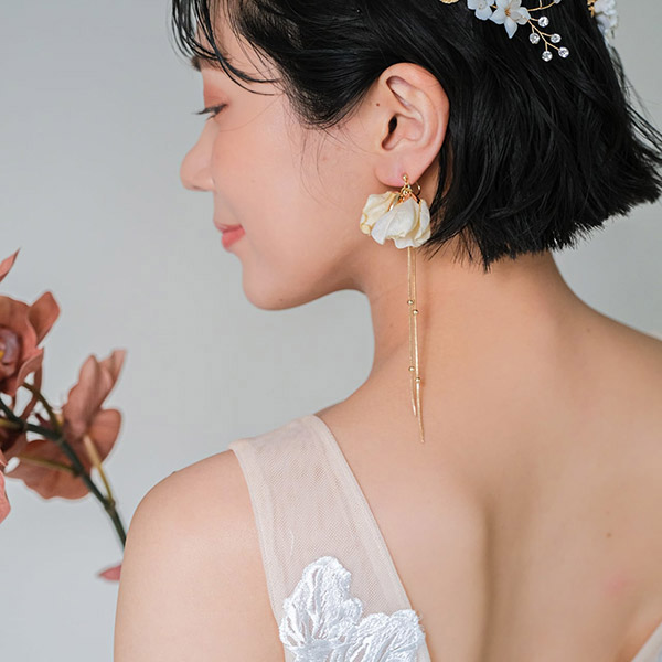 アイボリーのフラワーが繊細で、上品な華やかさが印象のブライダルイヤリングです。