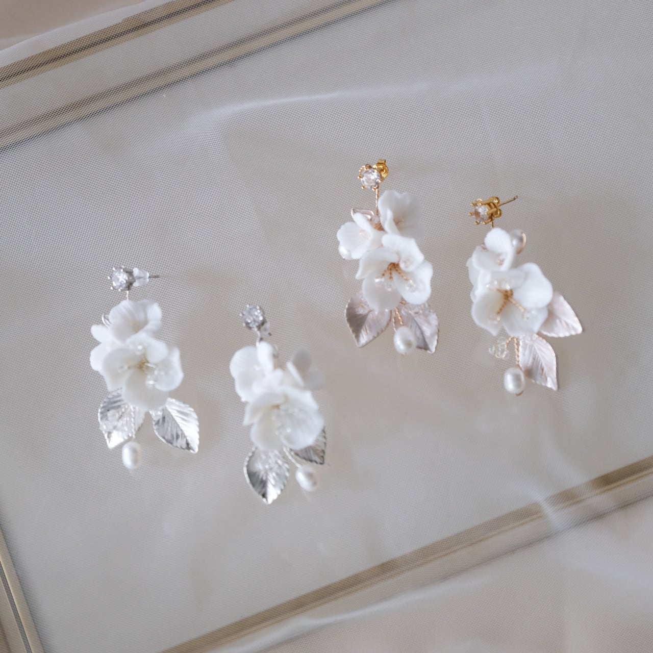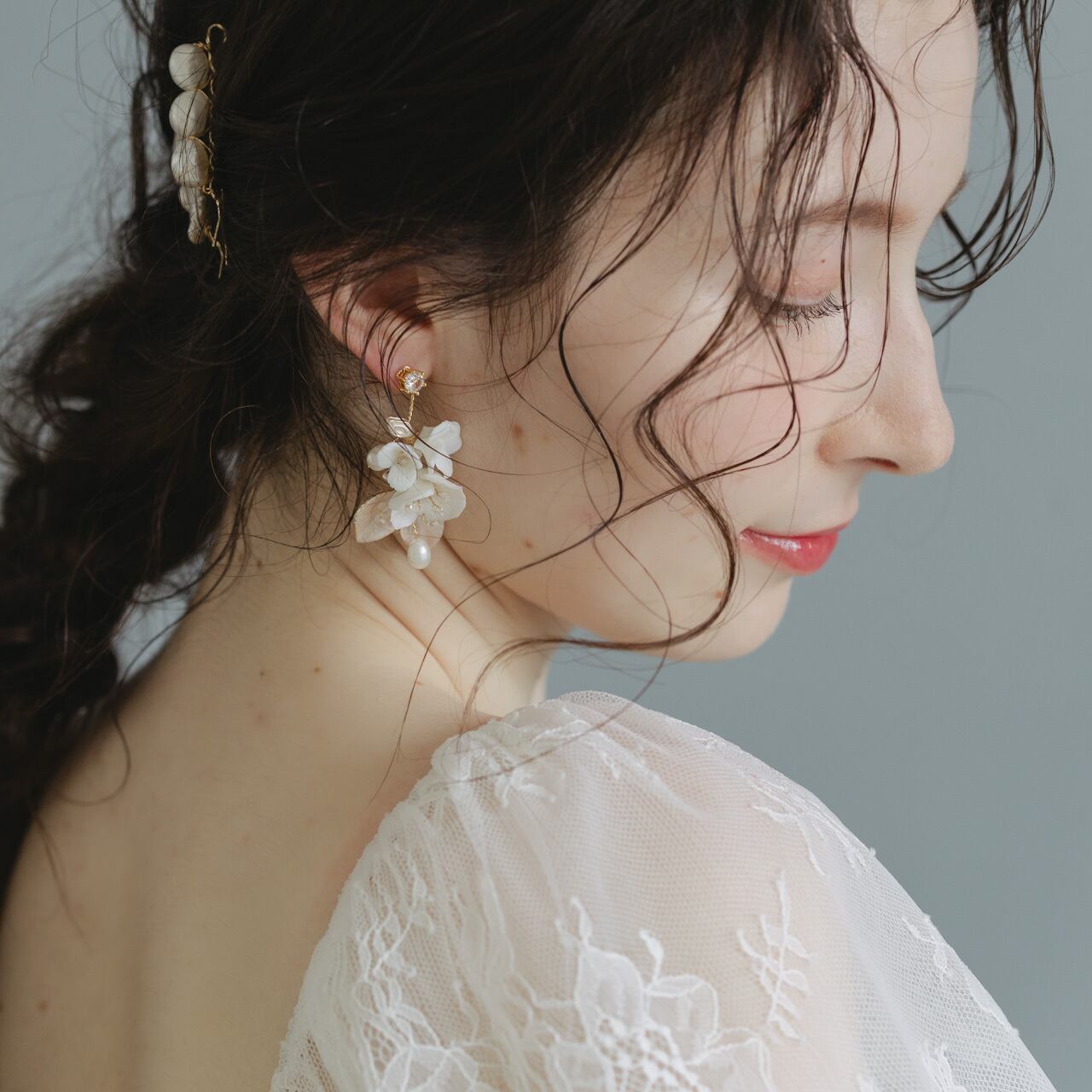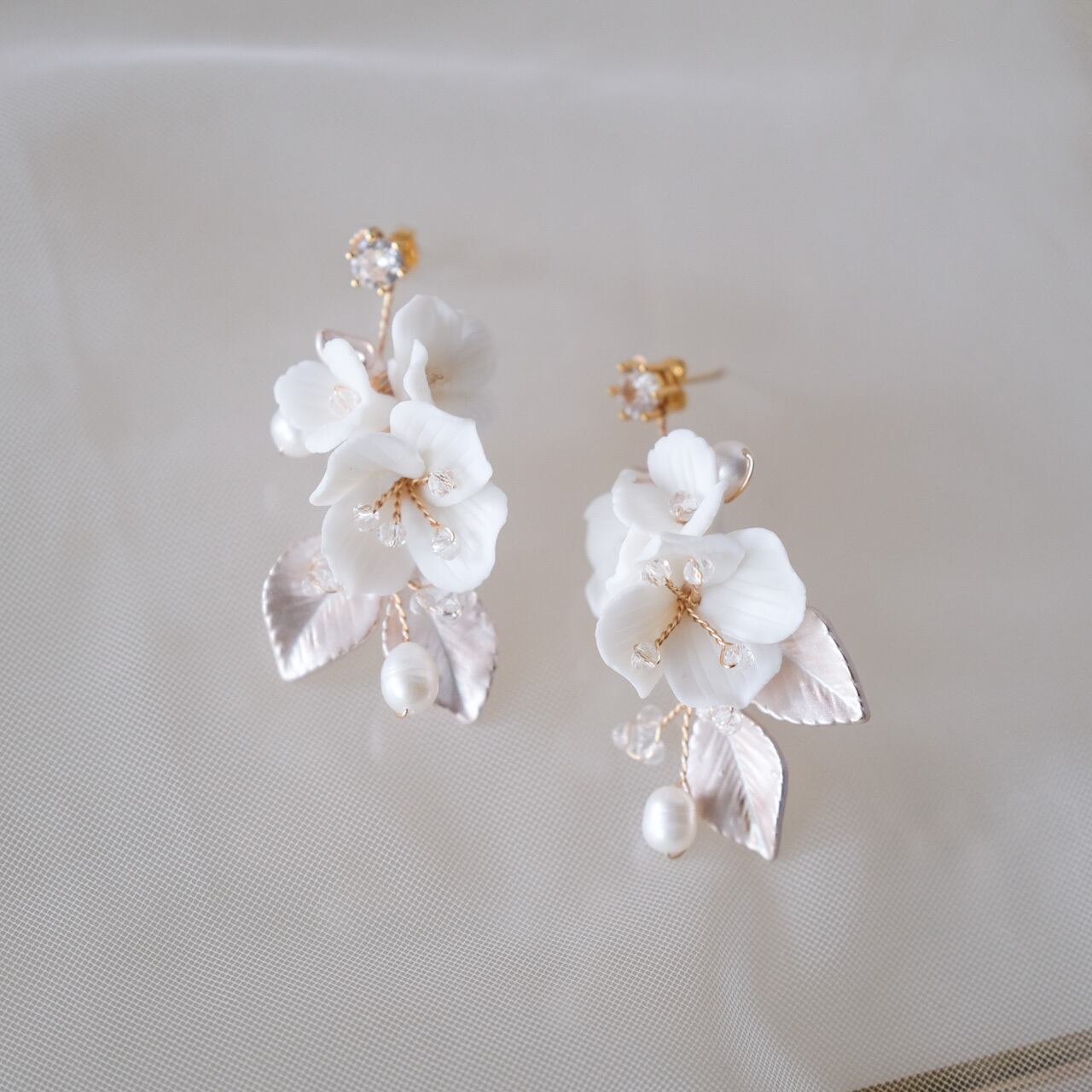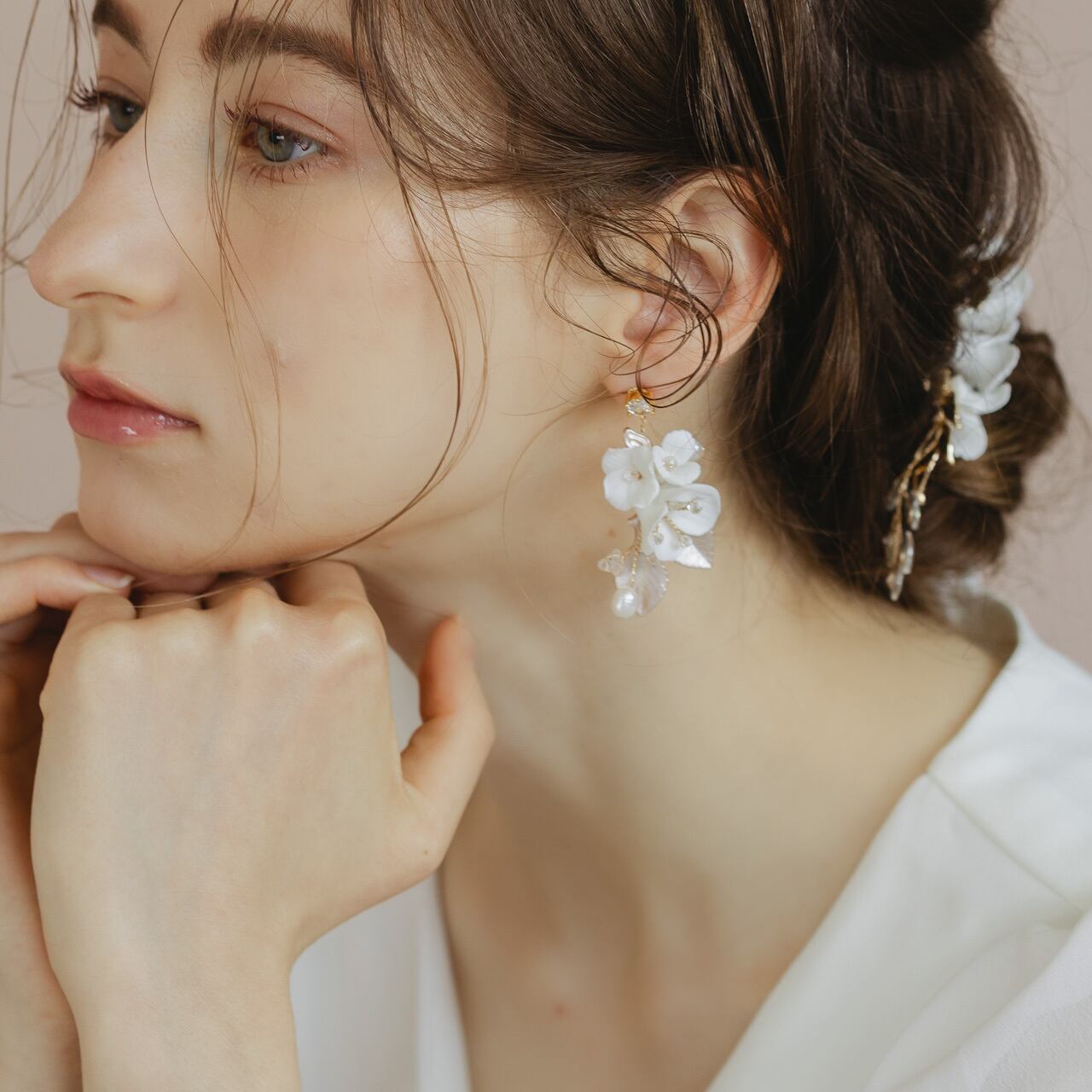 ブライダルにふさわしい、可憐な小花とビジューが美しく輝く白い花束のような小枝イヤリングです。