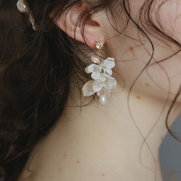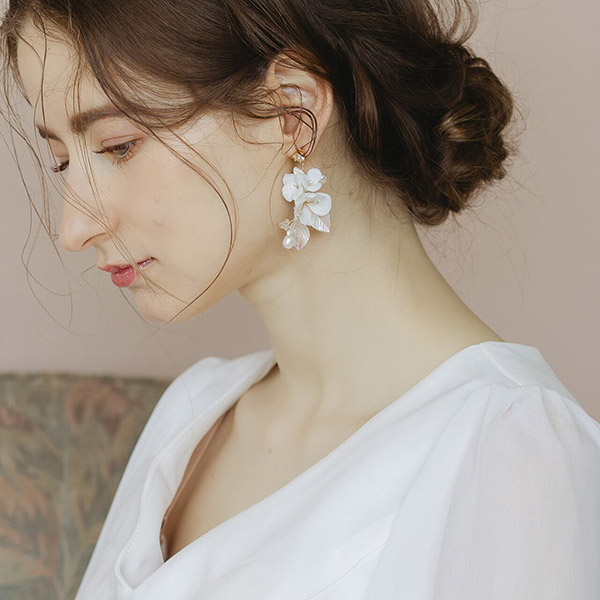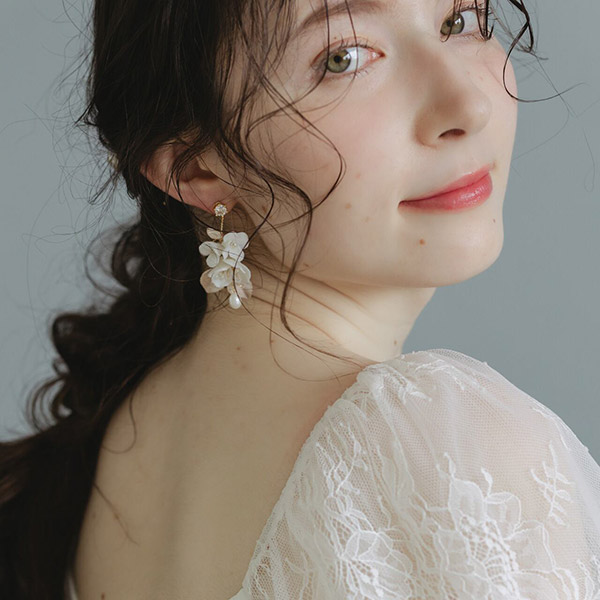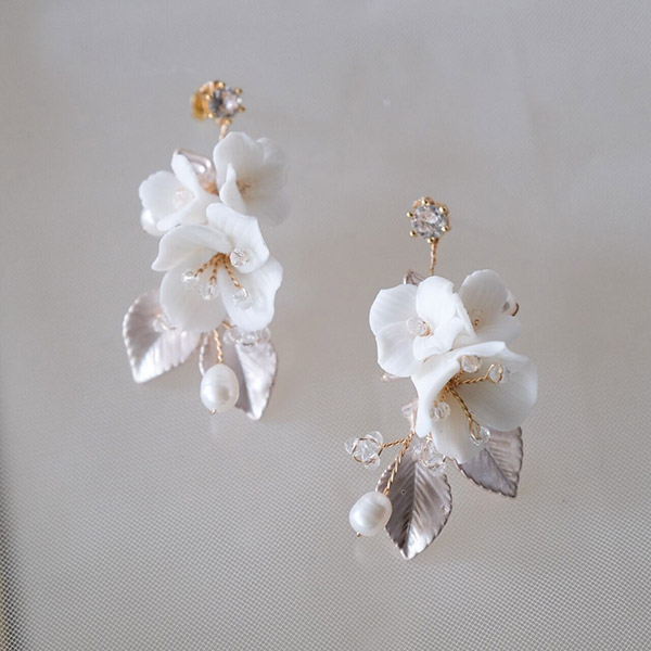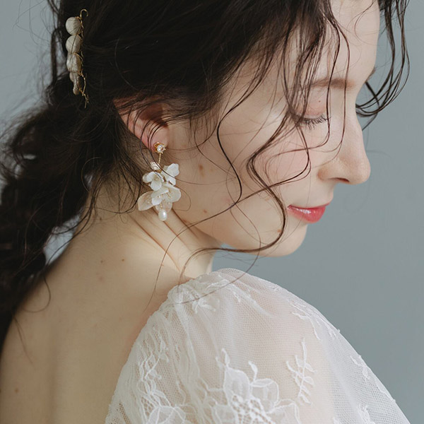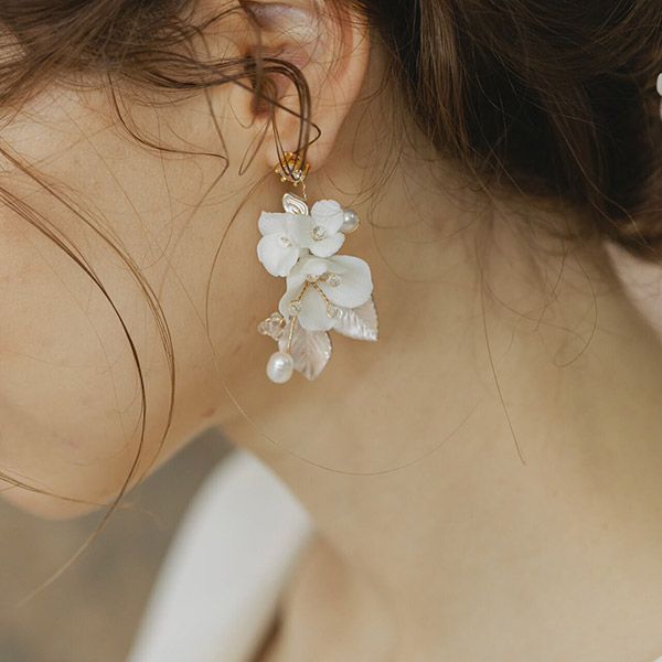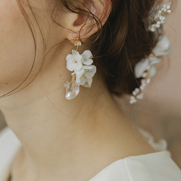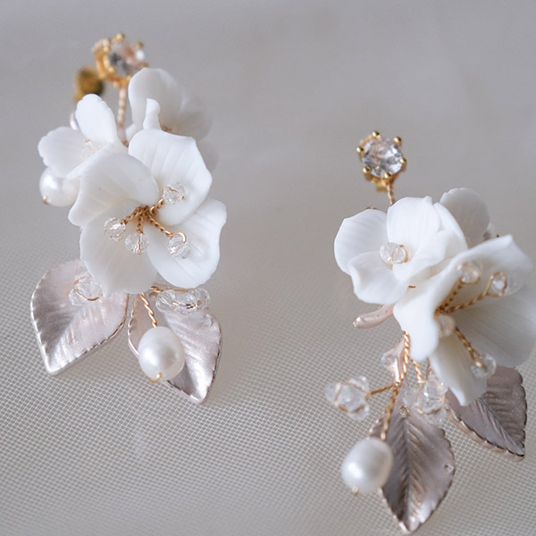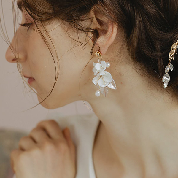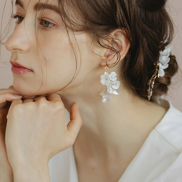 ブライダルにふさわしい、可憐な小花とビジューが美しく輝く白い花束のような小枝ピアスです。