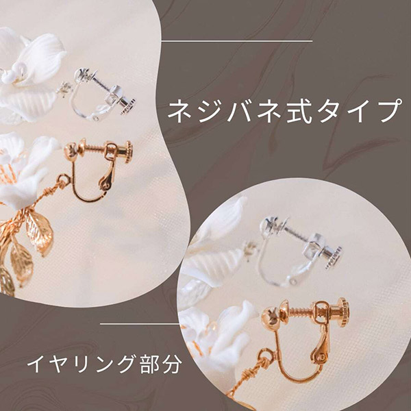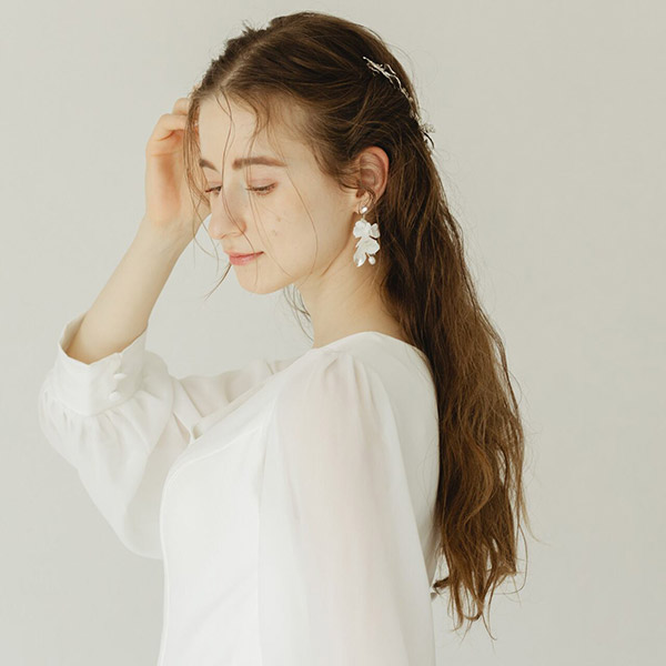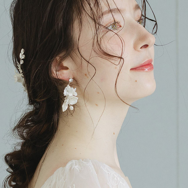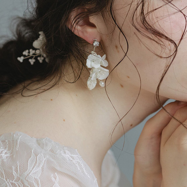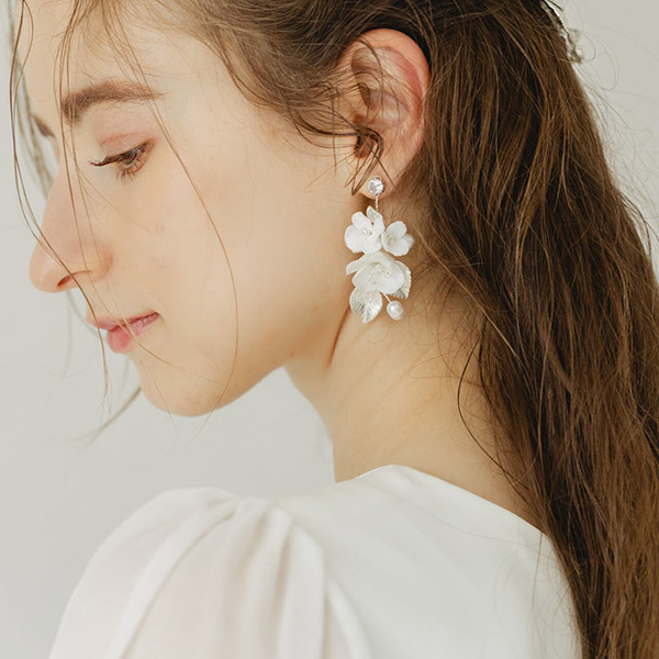 ブライダルにふさわしい、可憐な小花とビジューが美しく輝く白い花束のような小枝イヤリングです。