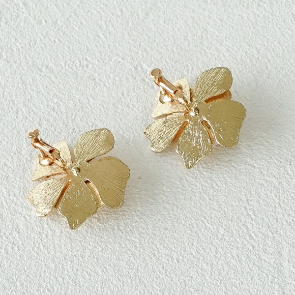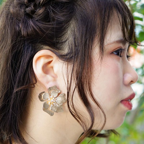ゴールドフラワーのイヤリング。シンプルなフラワーのイヤリング。レースのドレスや、カラードレスにあわせて、フラワーのワンポイントでよりおしゃれな花嫁に。