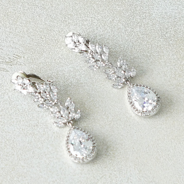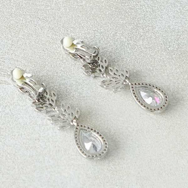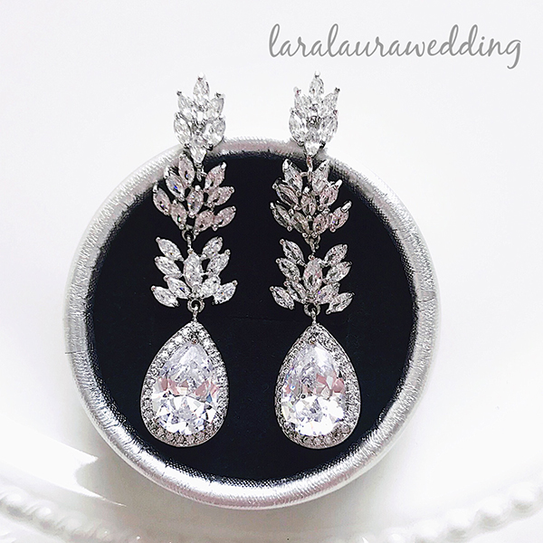 ジルコニアストーンのリーフモチーフイヤリング。大人っぽいリーフのデザインながらティアドロップのモチーフで上品なデザイン。ジルコニアストーンの輝きでお顔周りも華やかに。