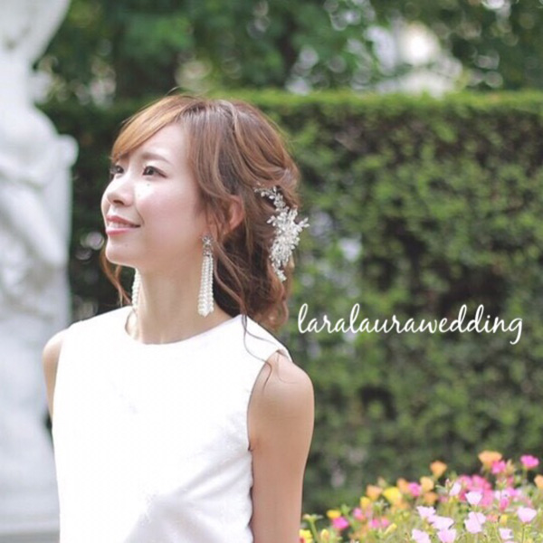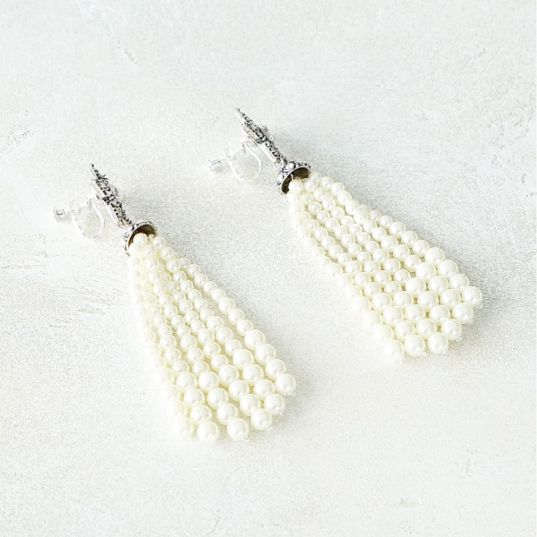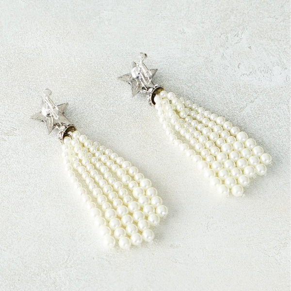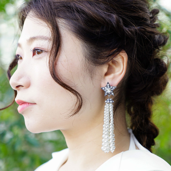 トレンドアイテムでオシャレ花嫁に。スターモチーフ、ホワイトパールとタッセルイヤリングでオシャレです。