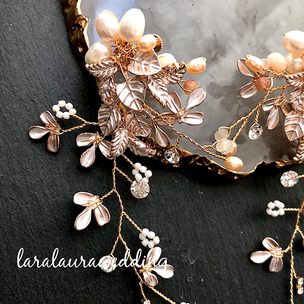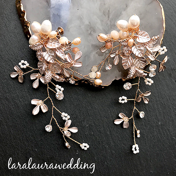 華奢なワイヤーに淡水パール、ストーンなど様々なパーツを紡いで作った小枝イヤリング。ナチュラルな印象の繊細なデザインです。