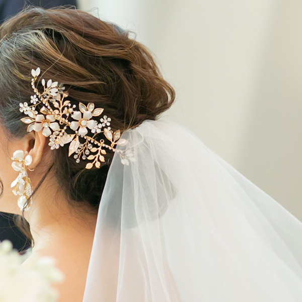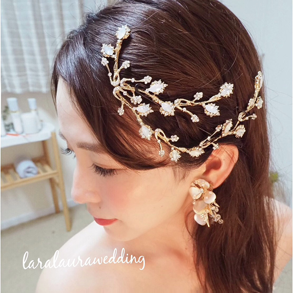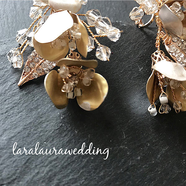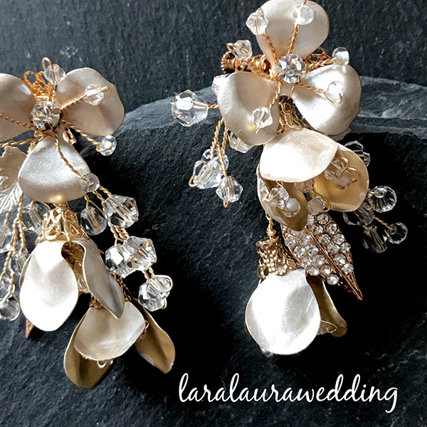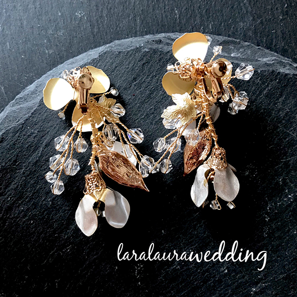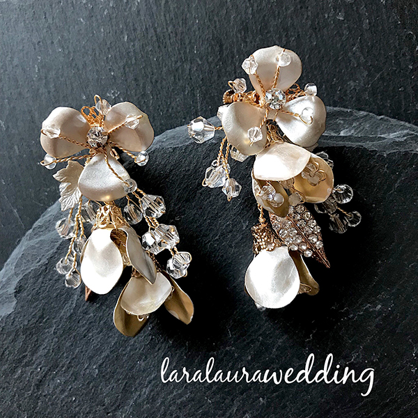 フラワー小枝のイヤリング。マット加工のフラワーにトクリスタルのビーズ、ストーンを紡いだイヤリング。ディテールにこだわり、洗練されたイヤリングです。ウェディングドレス、カラードレス、和装などに合わせやすいデザインとなります。